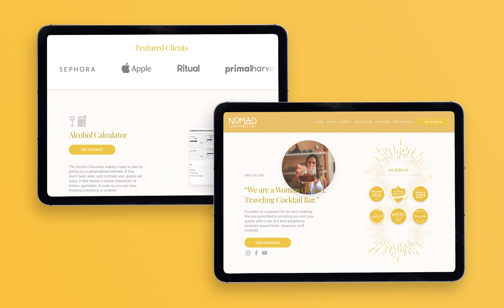 Nomad Cocktail Co. is a mobile bar service delivering curated, garden-to-glass cocktail experiences for weddings and private events. Brand identity and website were developed collaboratively to establish an elegant, native-inspired visual presence. Project included multiple design explorations and refinements to ensure cohesive branding across print and digital. Final deliverables positioned Nomad Cocktail Co. as an established and recognizable presence in the mobile bar industry.